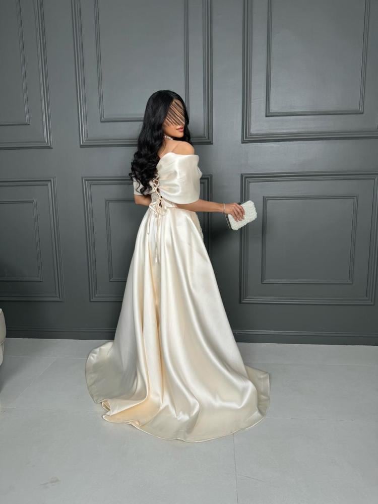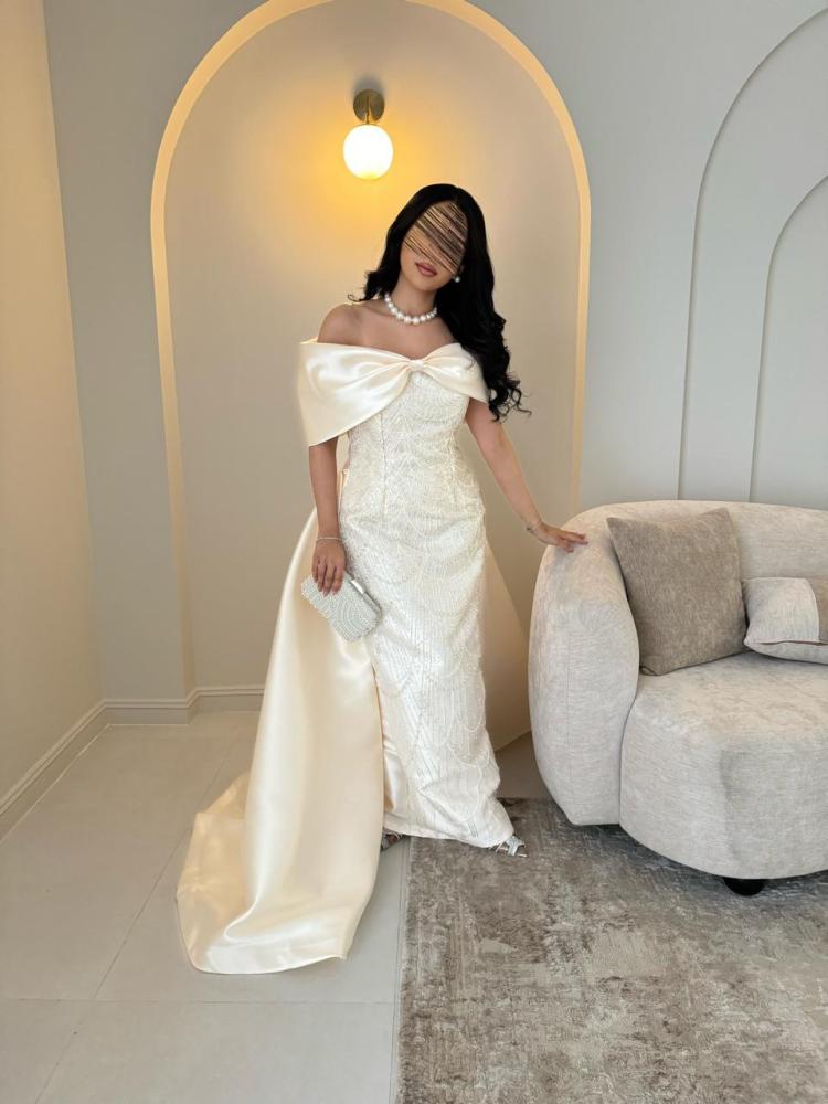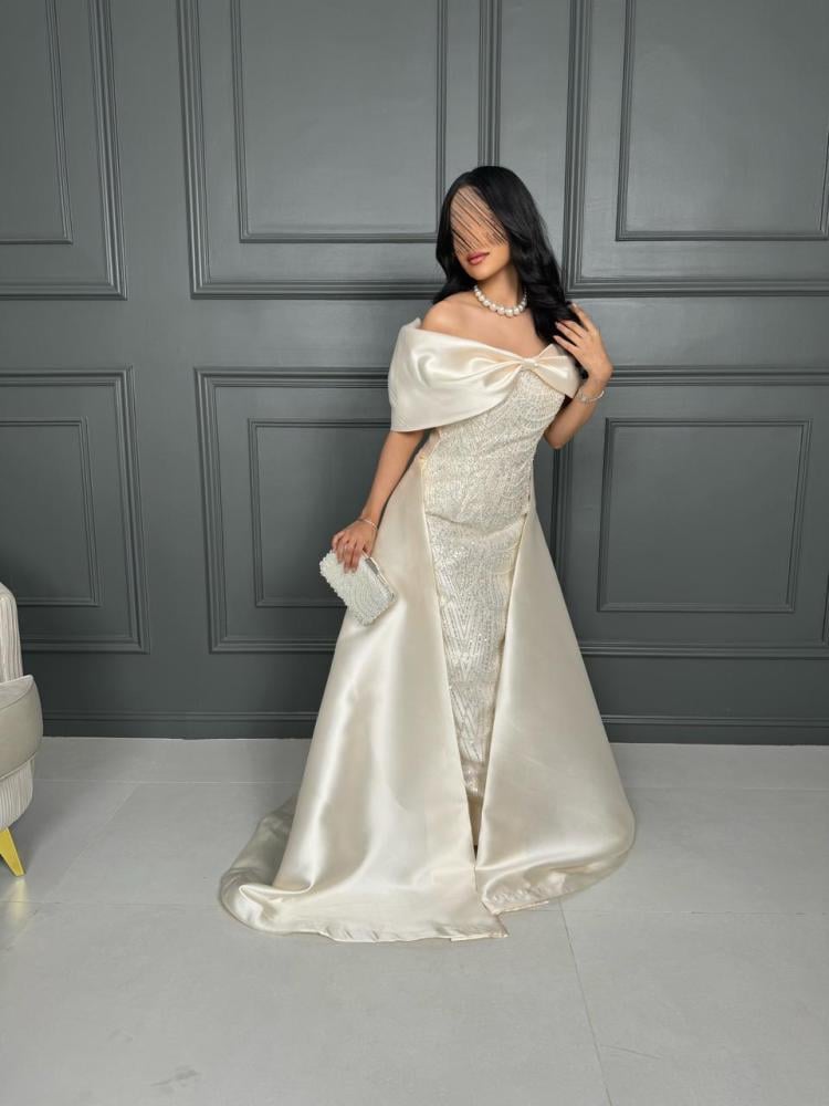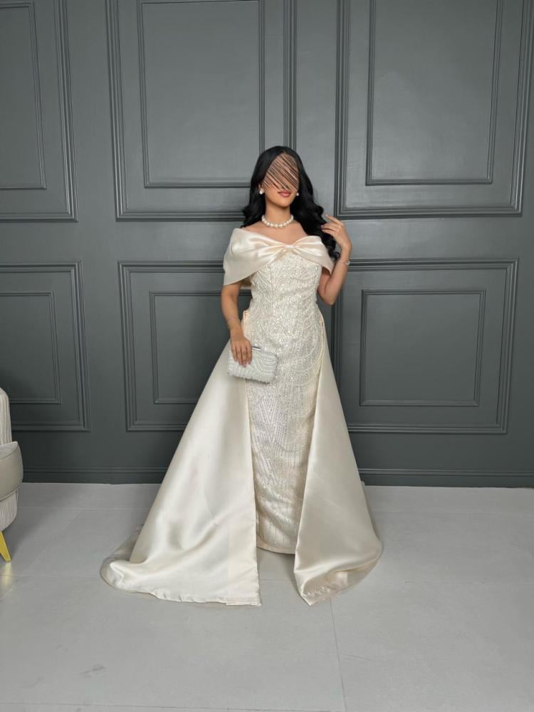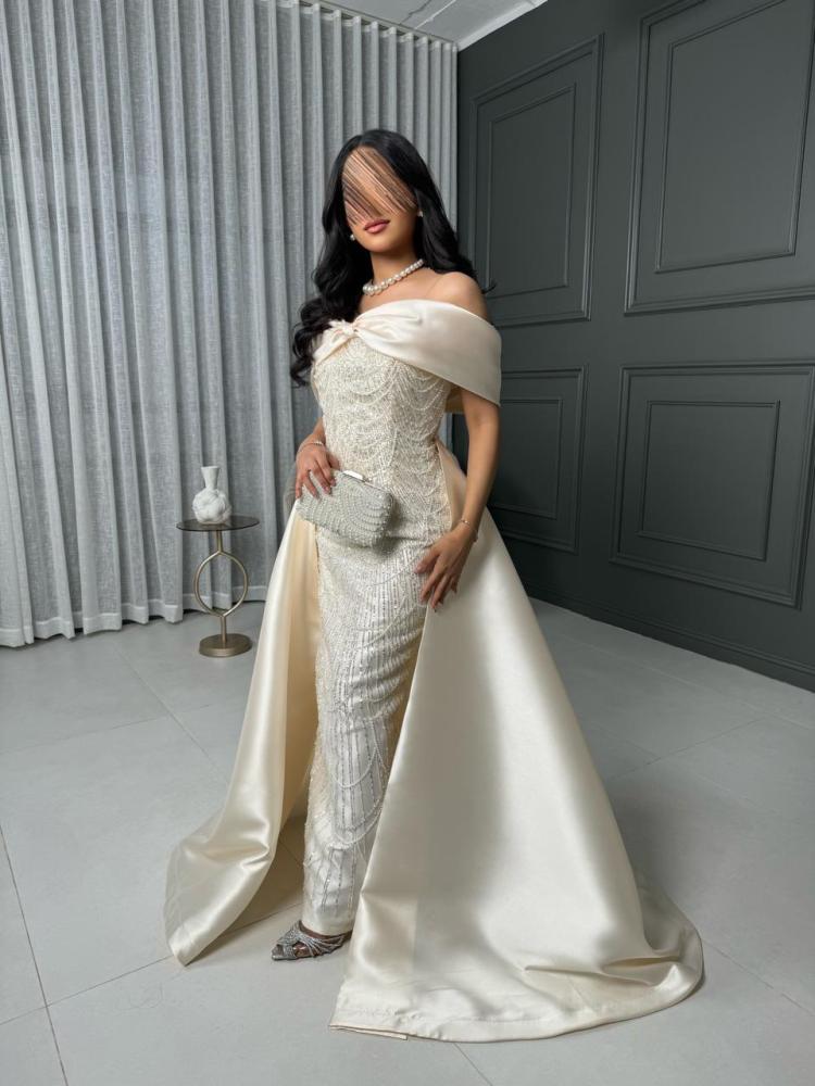 فستان سهرة ميكادو بتصميم أنيق مزين بذيل طويل وأنيق، مع تطريزات فاخرة تضفي لمسة من الفخامة والرقي. هذا الفستان مثالي للمناسبات الرسمية التي تتطلب إطلالة مذهلة.