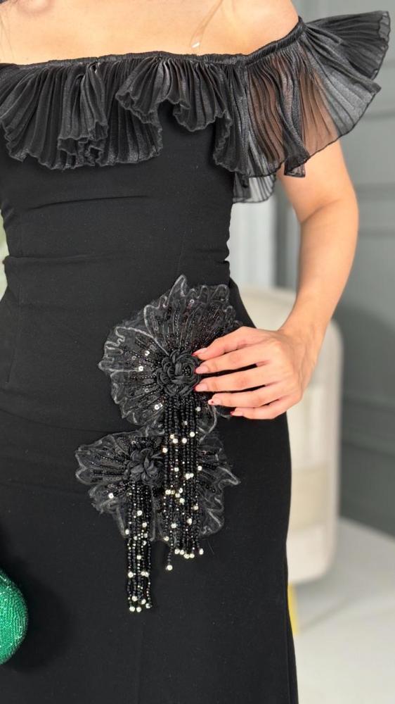 هذا الفستان الأسود هو مثال رائع للأناقة والجمال، يتميز بتصميمه الفريد الذي يجمع بين الأناقة الكلاسيكية ولمسة عصرية. يأتي بقصة جذابة تحتضن الجسم بشكل رائع، حيث يبرز منحنيات القوام.
